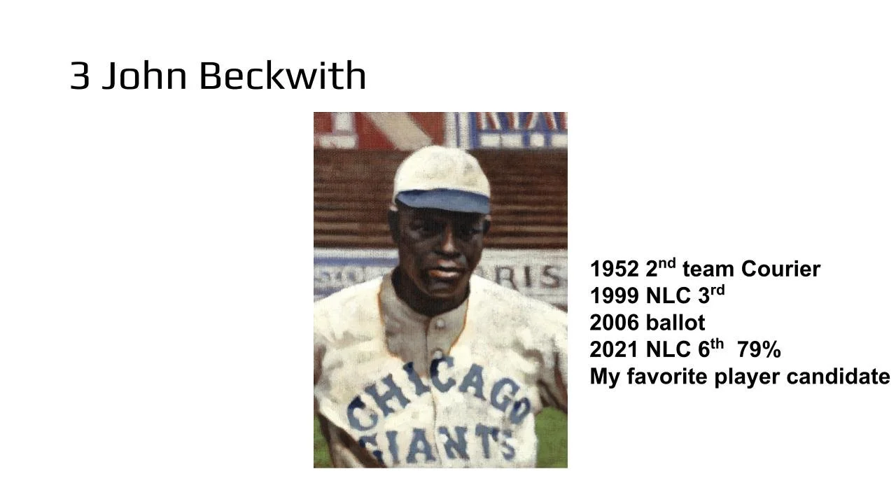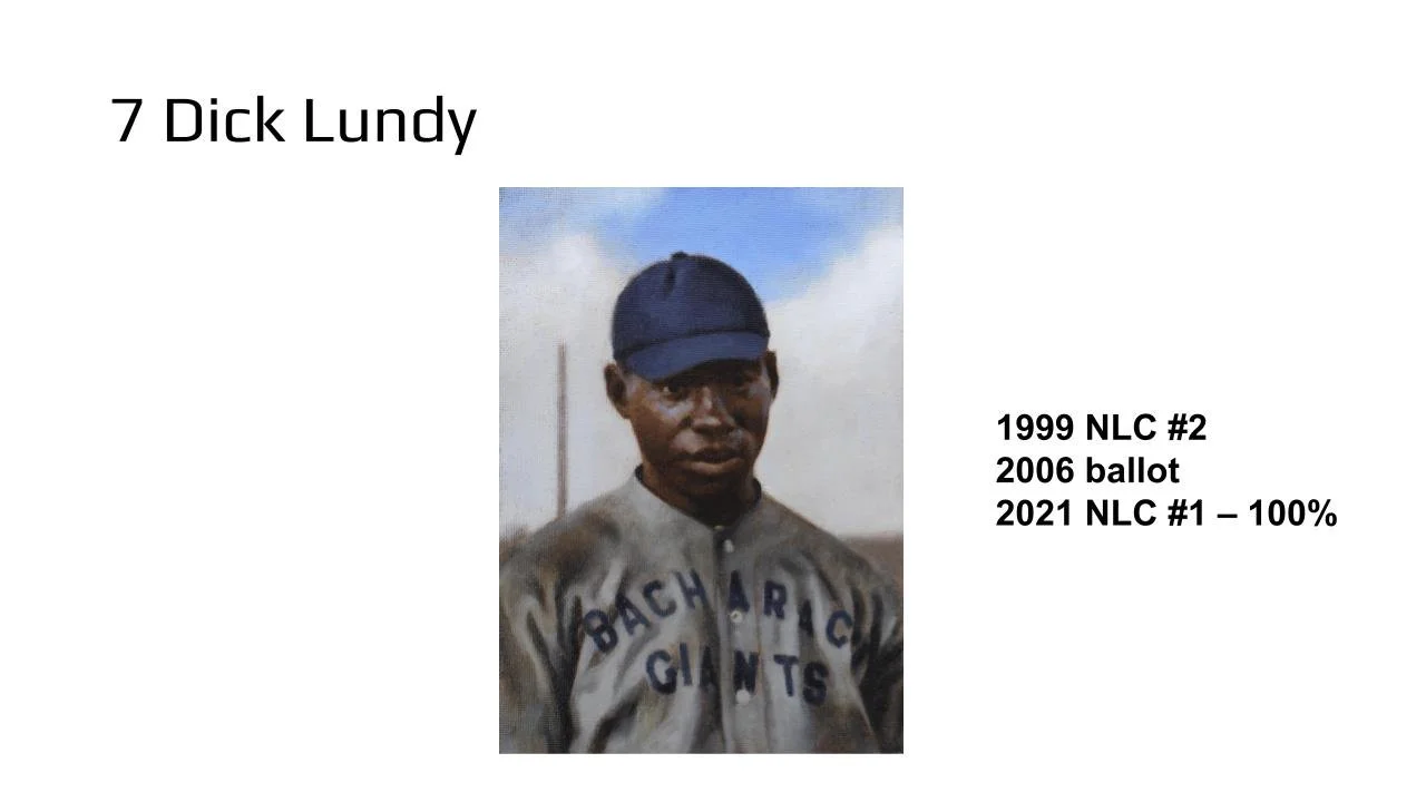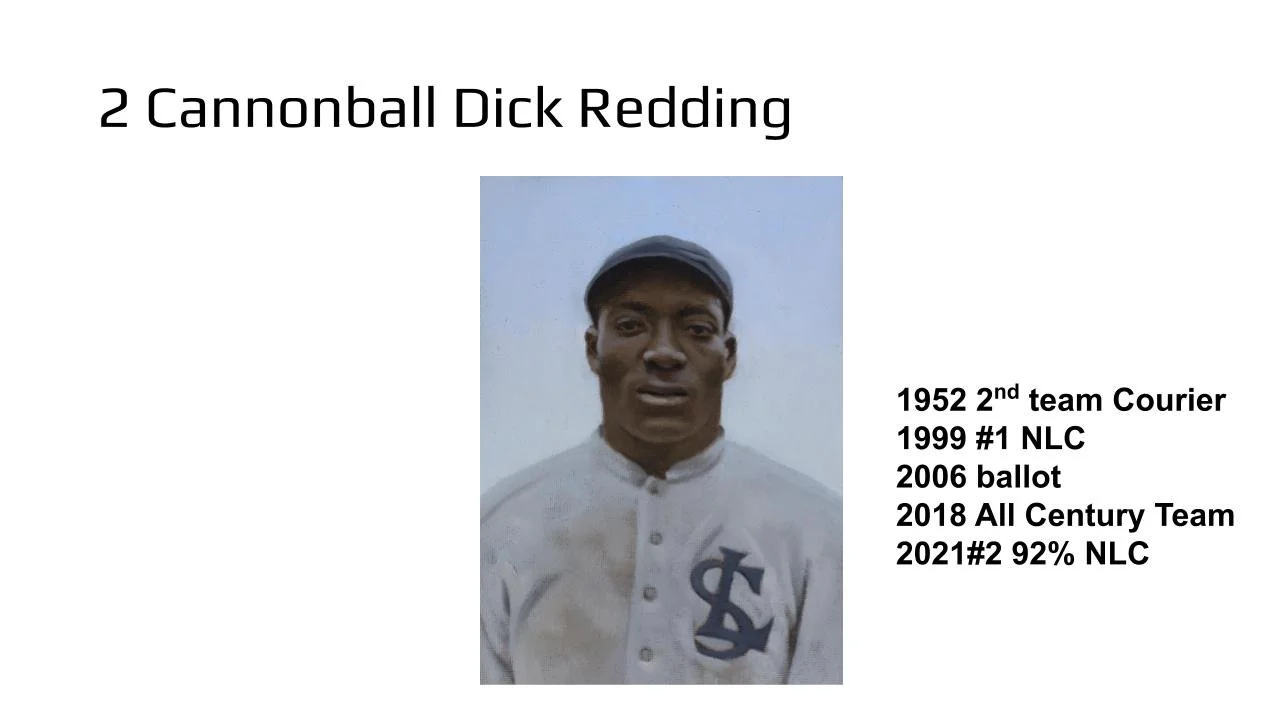 The 42 for '21 poll has now received input from 89 Negro League experts – writers, researchers, fans, artists, collectors – thus our results become more meaningful with each added vote. A total of 154 players, managers, executives, and even a couple of umpires have been considered. The top ten vote getters – all of whom falling two standard deviations beyond the mean of this poll – are shown in the PowerPoint slides.